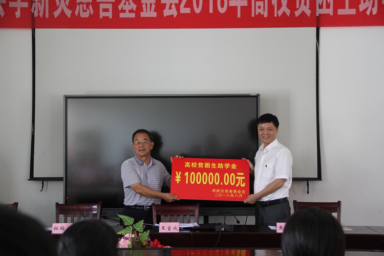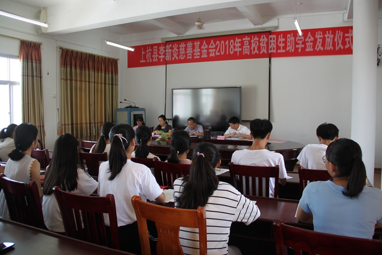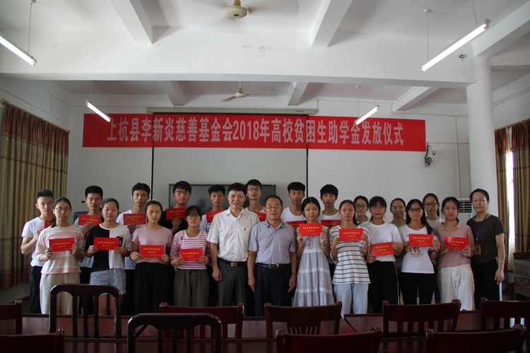 2018年8月22日上午,李新炎慈善基金会2018年高校贫困生助学金发放仪式在上杭县教育局五楼会议室举行。李新炎慈善基金会秘书长王室成,上杭县教育局局长黄从廷、资助中心主任杜梅兰及受助学生和部分学生家长参加了发放活动。 今年,基金会资助上杭县高校贫困学生20人,每人5000元,资助总额十万元。