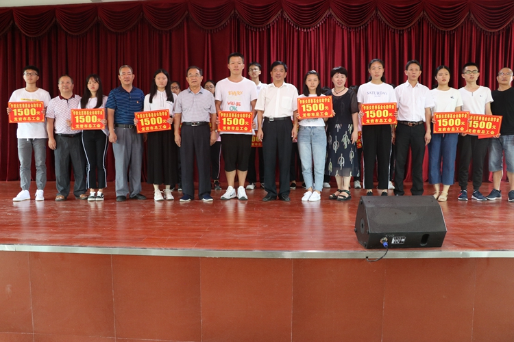 2018年8月27日上午,龙岩市总工会、李新炎慈善基金会连心帮扶金秋助学活动(白砂站)在上杭县白砂中学举行。李新炎慈善基金会秘书长王室成;龙岩市总工会党组书记、常务副主席刘先裘,法律保障部部长林添福;上杭县委常委、总工会主席罗小洪,县总工会党组书记、副主席赖永生;白砂镇党委领导、白砂中学校领导及受助学生和部分学生家长参加了活动。 今年,基金会资助白砂中学贫困学生21人,其中初中毕业生10人,每人1000元;高中毕业生11人,每人1500元,资助总额26500元。
